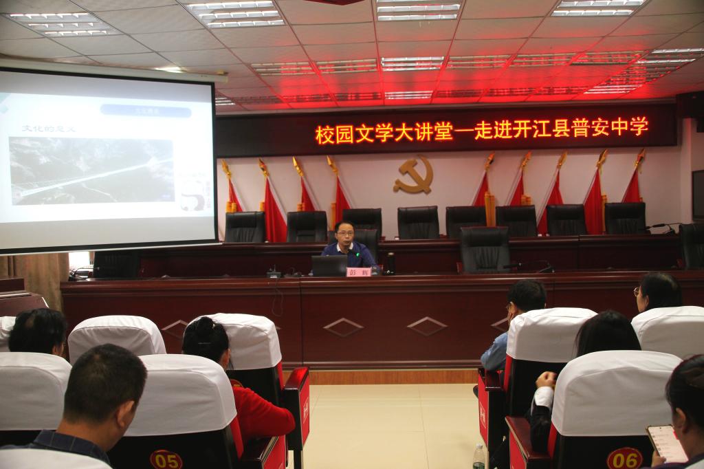 10月16日,由四川省青少年文学艺术社科普及基地、开江县作家协会、巴文化研究院共同主办的“校园文学大讲堂”文学志愿服务活动走进开江县普安中学,为该校近200名师生带来了两堂精彩纷呈的文学讲座。