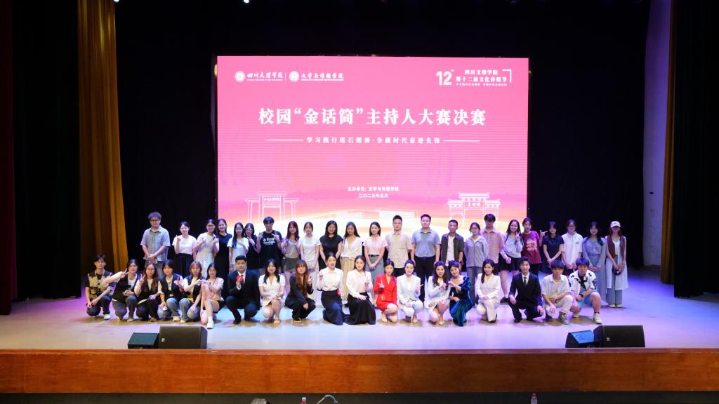 • 5月22日晚,第十二届文化传媒节校园“金话筒”主持人大赛决赛在艺术传媒大楼多功能厅举行。基地专家、文学与传播学院播音与主持艺术教研室主任李林翰、专业教师李慧、彭娜、刘少威、达州市融媒体中心主持人周雪梅组成评委团,共同见证选手们的精彩表现。