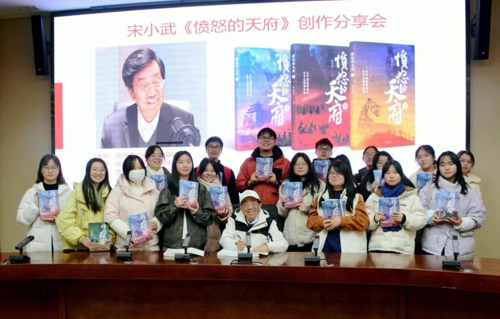 活动中,宋小武深入分享了自己的创作经历和感受,就如何历经五载打磨,作品背后蕴含着怎样的历史沉思与人文关怀,作了深入剖析。宋小武坦言,创作这部小说的初衷之一,就是要给张献忠一个正确的评价。在传统史学叙述中,张献忠常被描绘为残忍嗜杀的恶魔,而《愤怒的天府》则突破这一刻板印象,呈现了一个复杂且多面的张献忠形象。宋小武还耐心解答了学生关心的问题,就如何开展文学创作传授了自己的经验,希望学生要多读经典名著、善于观察、勤于记录、勇于写作。
